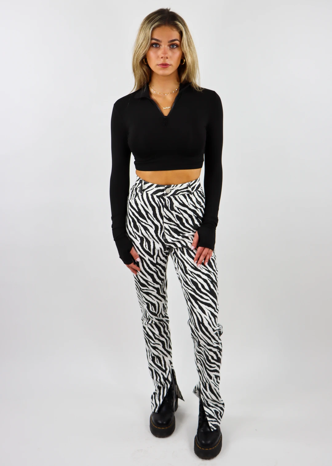 We are obsessing over this cropped sleek top! It features a quarter zip front fastening, a stretched ribbed cotton material, and it’s cropped. Dress this up with a pair of high waisted jeans or dress down with a cute pair of leggings.