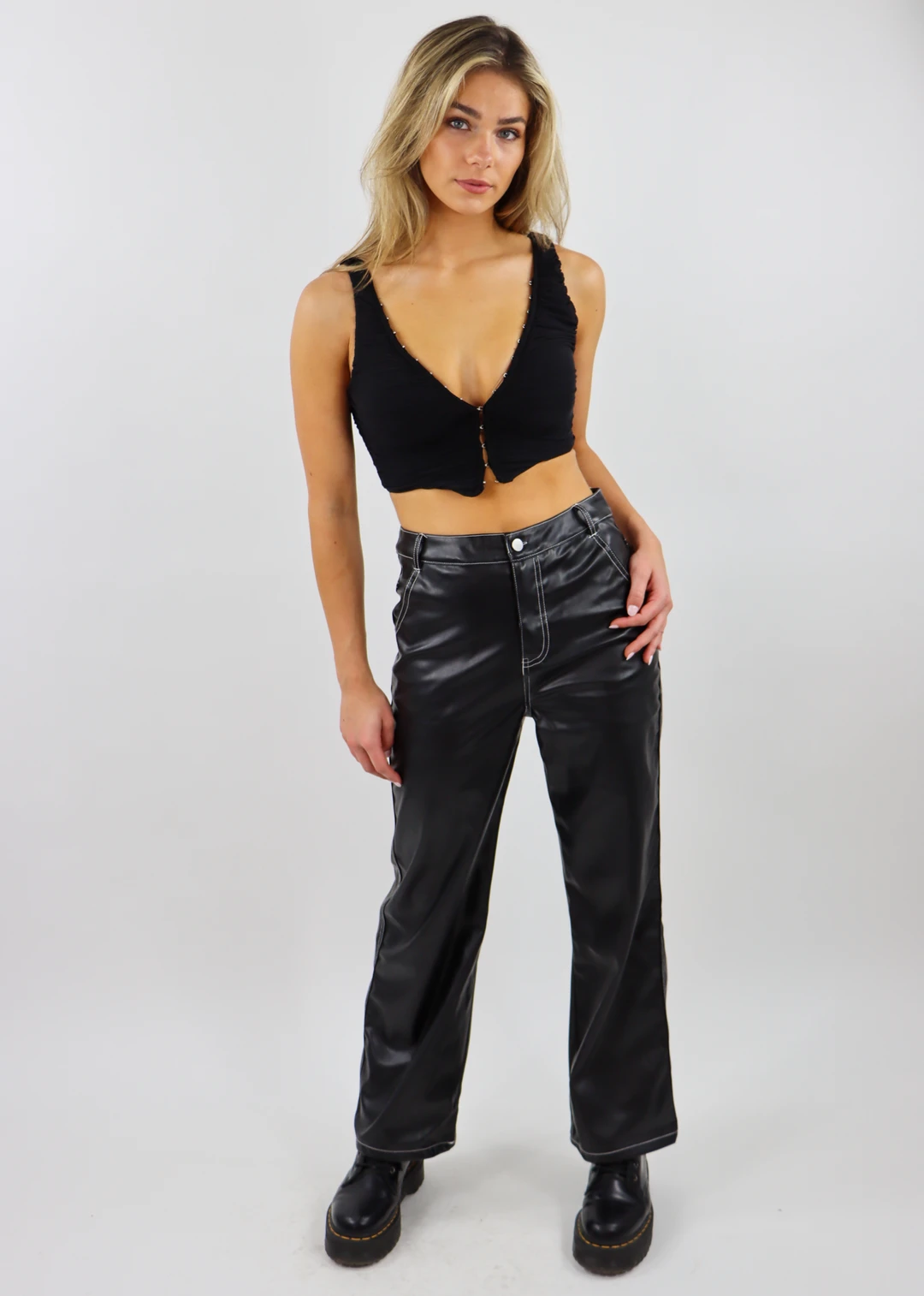We are obsessed with this perfect going out crop top! It features a ruched mesh detailing, a hook eye front closure, and did we mention its cropped. The hook and eyes allow for you to make this top either a v-neck or a high neck top. Top it off with leather pants or high-waisted jeans. We know you’ll be feeling yourself in this top!