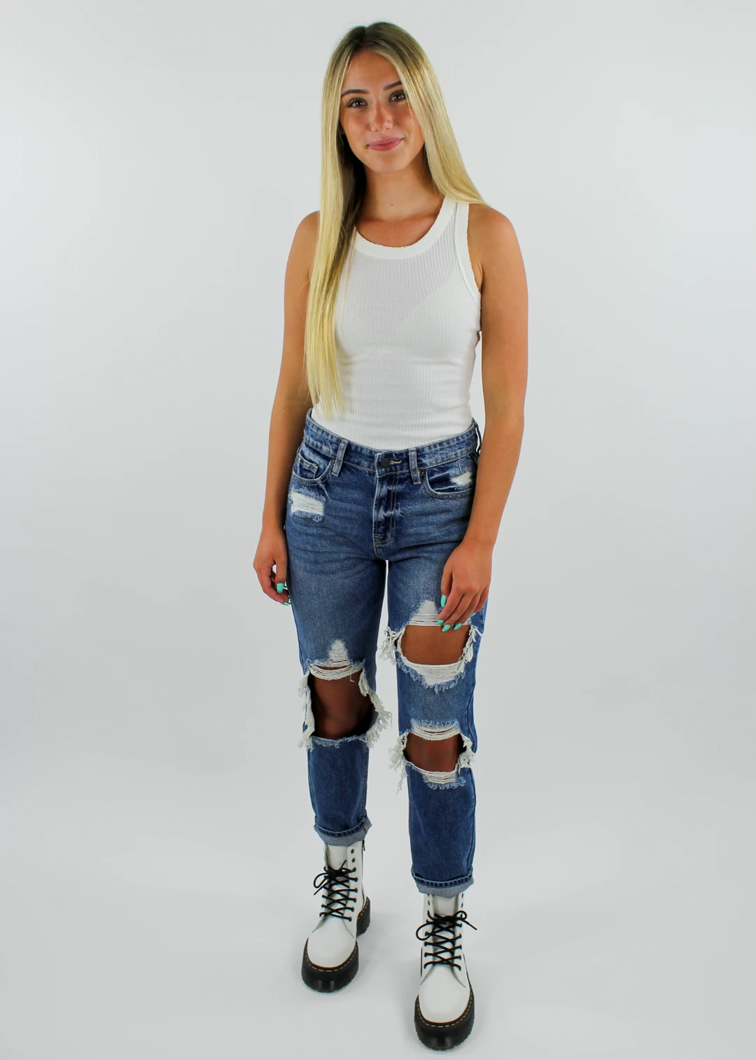 This full length cream ribbed tank is a must have! It features an added edge detailing on the arm hole and neckline that is is too cute. It is so comfy and is perfect for any occasion.