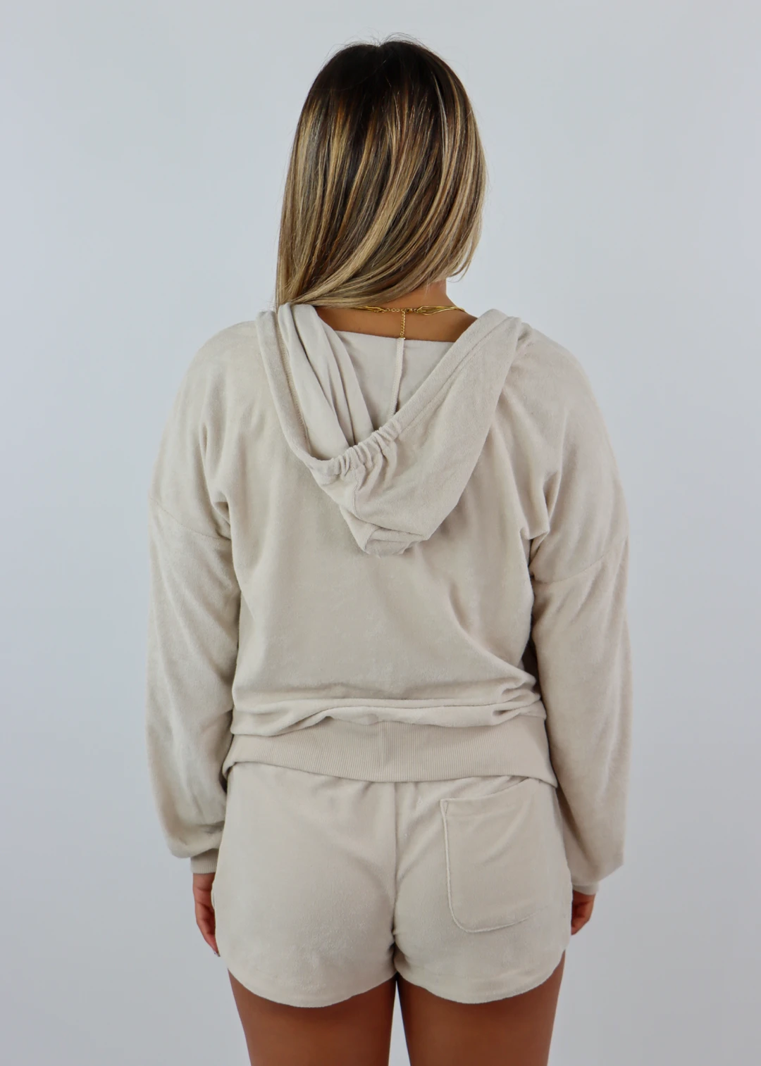 This tan terry cloth zip-up is going to be your newest obsession! The drawstring hood detail and zipper front make this the perfect layering piece. We also love the terry cloth material because it is so comfortable you’ll never want to take it off! The best part of this zip-up hoodie is that it comes with matching shorts to make the perfect set that can be worn together or separately. We can’t wait to see how you style this piece!